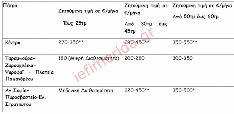 Στις περιοχές του κέντρου της Πάτρας, από την Αγία Σοφία έως και τον Ιερό Ναό του Αγίου Ανδρέα, 6 στα 10 διαθέσιμα προς μίσθωση ακίνητα άνω του 1ου ορόφου έως 50τμ, έχουν ζητούμενο μίσθωμα άνω των 350€, εκ των οποίων τα τρία έχουν ζητούμενο μίσθωμα άνω των 450€.