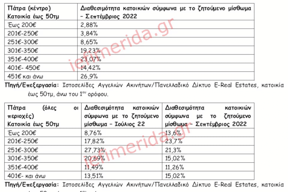 Σύμφωνα με τις αναρτημένες αγγελίες ακινήτων σε ιστοσελίδες, η διαθεσιμότητα κατοικιών, κατάλληλα για φοιτητές άνω του 1ου ορόφου έως 50τμ με ζητούμενο μίσθωμα έως 300€, αποτελούν μόλις το 19,7% επί του συνόλου των διαθέσιμων κατοικιών. Τον Ιούλιο, το αντίστοιχο ποσοστό διαθεσιμότητας ήταν 25,14%. Το 47,73%, δηλαδή περίπου πέντε στις δέκα κατοικίες έως 50τμ, έχουν ζητούμενο μίσθωμα από 300€ έως 400€.