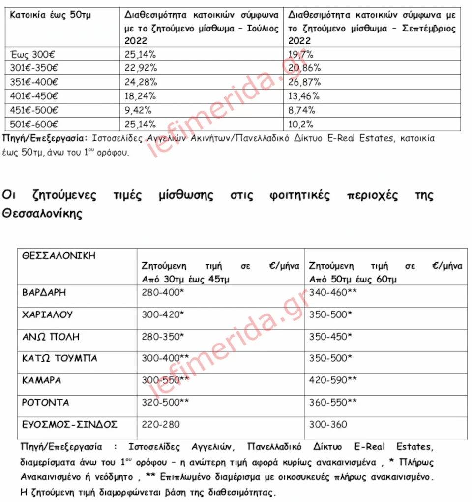 Σύμφωνα με έρευνα του Πανελλαδικού Κτηματομεσιτικού Δικτύου E- Real Estates, η φετινή χρονιά αναδεικνύεται πιο δύσκολη χρονιά ακόμη και από τα χρόνια των μνημονίων. «Η εξίσωση είναι πολύ δύσκολη για χιλιάδες οικογένειες, καθώς το κόστος στέγασης δεν αφορά μόνο το μίσθωμα, αλλά το κόστος θέρμανσης, κοινοχρήστων και λοιπών λογαριασμών. Σε πολλές περιπτώσεις, το συνολικό κόστος διαβίωσης ενός φοιτητής αγγίζει τα 1.000€/μήνα», τονίζει ο πρόεδρος του Δικτύου, Θεμιστοκλής Μπάκας.