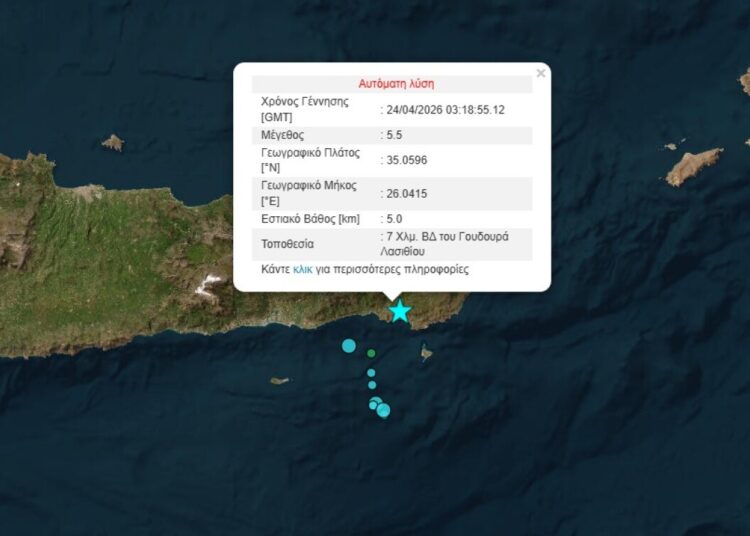Σύμφωνα με το Γεωδυναμικό Ινστιτούτο, ο σεισμός ήταν μεγέθους 5,7 βαθμών της κλίμακας ρίχτερ, και σημειώθηκε στη θαλάσσια περιοχή 7 χιλιόμετρα νοτιοδυτικά του Γούδουρα Λασιθίου.