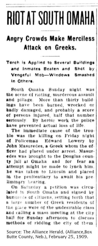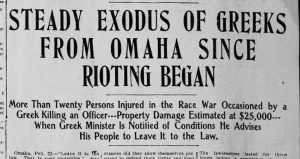 Η ελληνική κοινότητα της Όμαχα και της Νότιας Όμαχα στη Νεμπράσκα αριθμούσε περίπου στους 2.000 κατοίκους, οι οποίοι όμως μπήκαν στο στόχαστρο της αμερικανικής κοινότητας. Στην αρχή έλεγαν ότι «οι Έλληνες δεν θέλουν να εναρμονιστούν με την τοπική κοινωνία» και επιχειρηματολογούσαν πως «έχουν την αντιαμερικανική συνήθεια να διατηρούν τα δικά τους μανάβικα και καφενεία». Έλεγαν πως «θέλουν να βουτήξουν τα δολάρια» για να «επιστρέψουν με αυτά στη φτωχή τους χώρα». Υπερθεμάτιζαν μάλιστα πως «ο Έλληνας μετανάστης κλέβει τις δουλειές των Αμερικανών γιατί πηγαίνει να δουλέψει με ψίχουλα και όχι με αξιοπρεπείς μισθούς» κτλ. κτλ. κτλ.