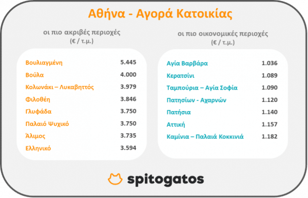 Συγκεκριμένα, οι ακριβότερες περιοχές για αγορά κατοικίας στο λεκανοπέδιο είναι, μεταξύ άλλων, η Βουλιαγμένη και η Βούλα, η περιοχή του Κολωνακίου και του Λυκαβηττού, η Φιλοθέη, η Γλυφάδα, το Παλαιό Ψυχικό, ο Άλιμος και το Ελληνικό. Στις οικονομικότερες περιοχές για αγορά κατοικίας το πρώτο τρίμηνο του 2022 είναι η Αγία Βαρβάρα, το Κερατσίνι και η περιοχή Ταμπούρια – Αγία Σοφία στον Πειραιά.