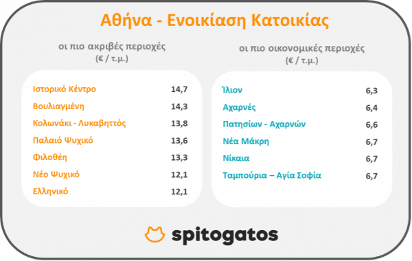 Ως προς την ενοικίαση κατοικίας, το ιστορικό κέντρο, η Βουλιαγμένη, η περιοχή του Κολωνακίου και του Λυκαβηττού, το Παλαιό Ψυχικό, το Νέο Ψυχικό και η Φιλοθέη είναι μεταξύ των ακριβότερων περιοχών της Αττικής, ενώ στη λίστα με τις περιοχές όπου εντοπίζονται τα ακριβότερα ενοίκια συγκαταλέγεται και το Ελληνικό.