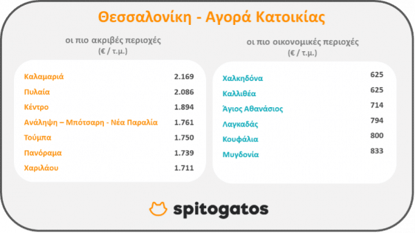 Αντίστοιχα, στη Θεσσαλονίκη, οι πιο ακριβές περιοχές για αγορά κατοικίας το α’ τρίμηνο του 2022 ήταν, μεταξύ άλλων, η Καλαμαριά, η περιοχή του κέντρου και το Πανόραμα -στοιχείο το οποίο δεν προκαλεί εντύπωση καθώς πρόκειται για περιοχές που παραδοσιακά ανήκουν στις ακριβότερες τις συμπρωτεύουσας, η περιοχή Ανάληψη – Μπότσαρη – Νέα Παραλία, η Πυλαία και η Τούμπα. Ως προς την αγορά κατοικίας, οι οικονομικότερες περιοχές περιλαμβάνουν, μεταξύ άλλων, την Καλλιθέα, τη Χαλκηδόνα, τον Άγιο Αθανάσιο, τον Λαγκαδά και τα Μυγδόνια.