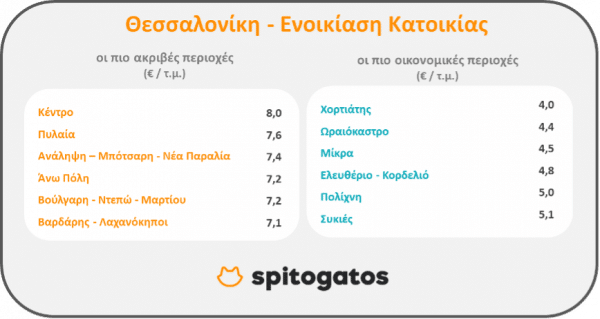 Σε ό,τι αφορά την ενοικίαση κατοικίας, οι ακριβότερες περιοχές ήταν, πέραν του κέντρου της πόλης, η Πυλαία, η Ανάληψη – Μπότσαρη – Νέα Παραλία, η Άνω Πόλη και οι περιοχές Βούλγαρη – Ντεπώ – Μαρτίου και Βαρδάρης – Λαχανόκηποι. Στις οικονομικότερες περιοχές για ενοικίαση κατοικίας, εντοπίζονται ο Χορτιάτης, το Ωραιόκαστρο, ο Δήμος Μίκρας, η Πολίχνη και οι Συκιές.