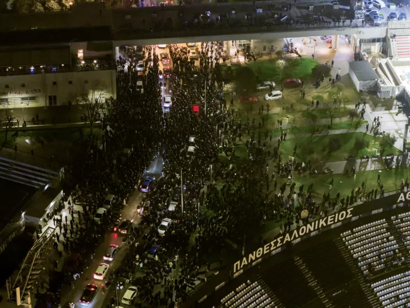 Τα «αετόπουλα» αποχαιρέτησαν τους αδικοχαμένους νέους με κόρνες και συνθήματα όπως «Αδέλφια ζείτε, εσείς μας οδηγείτε», ενώ πυρσοί έκαναν «τη νύχτα μέρα».