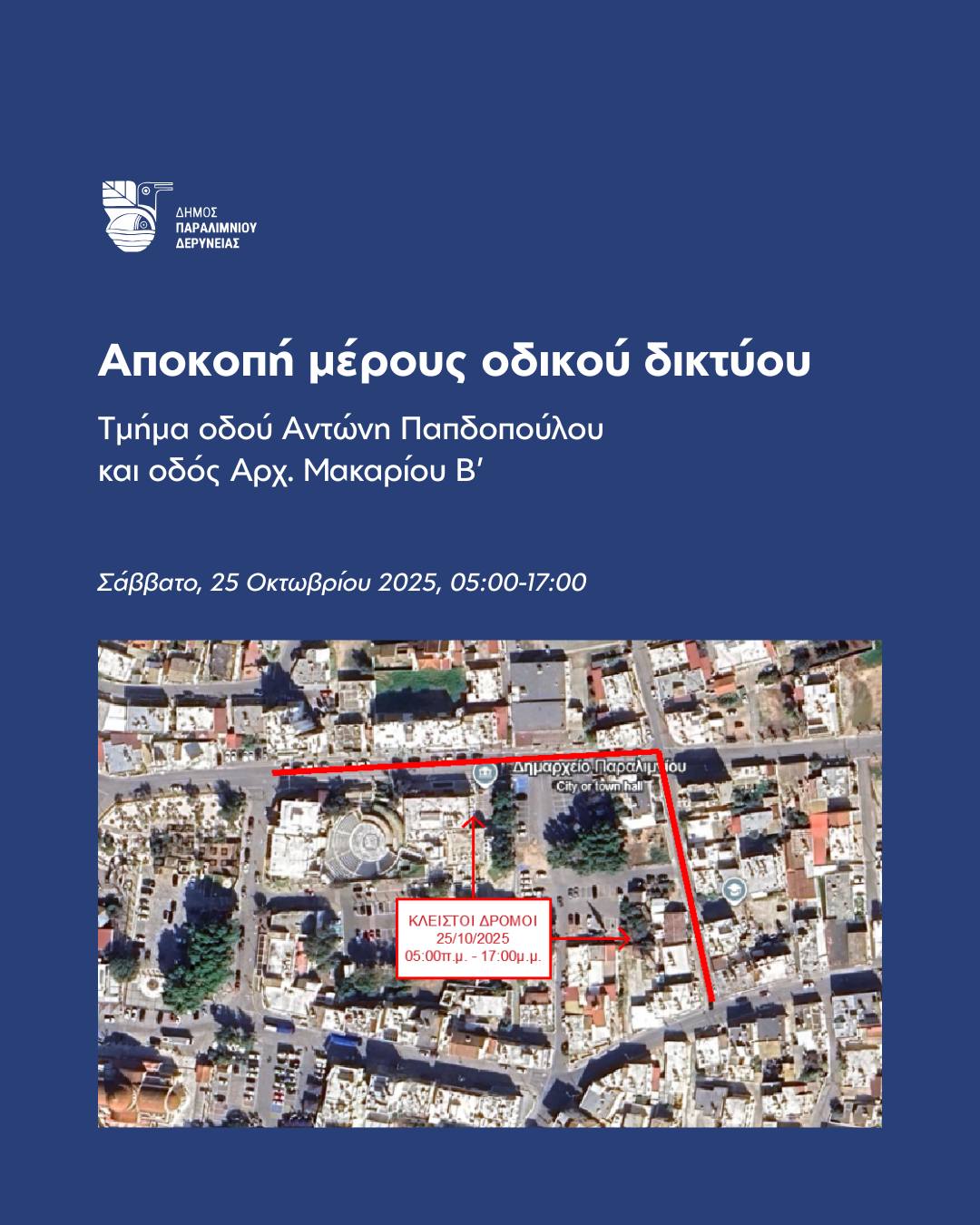 Ο Δήμος Παραλιμνίου – Δερύνειας ενημερώνει ότι στο πλαίσιο της ανέγερσης του Στεγασμένου Χώρου Στάθμευσης δίπλα από το Δημοτικό Μέγαρο, η οδός Μακαρίου Β’ και τμήμα της οδού Αντώνη Παπαδοπούλου θα παραμείνουν κλειστά το Σάββατο 25 Οκτωβρίου 2025 από τις 5 π.μ. μέχρι και τις 5 μ.μ.