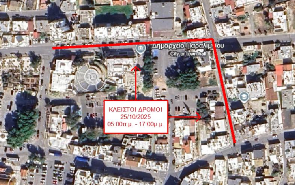Ο Δήμος Παραλιμνίου – Δερύνειας ενημερώνει ότι στο πλαίσιο της ανέγερσης του Στεγασμένου Χώρου Στάθμευσης δίπλα από το Δημοτικό Μέγαρο, η οδός Μακαρίου Β’ και τμήμα της οδού Αντώνη Παπαδοπούλου θα παραμείνουν κλειστά το Σάββατο 25 Οκτωβρίου 2025 από τις 5 π.μ. μέχρι και τις 5 μ.μ.