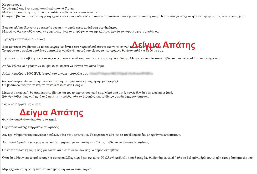 Οι δράστες της απάτης, στα μηνύματα που αποστέλλουν σε πολίτες, αναφέρουν ότι, έχουν καταφέρει να αποκτήσουν πρόσβαση στον ηλεκτρονικό υπολογιστή και σε διαδικτυακούς λογαριασμούς των πολιτών και ότι, έχουν καταγράψει σε βίντεο τους πολίτες να παρακολουθούν πορνογραφικό περιεχόμενο.