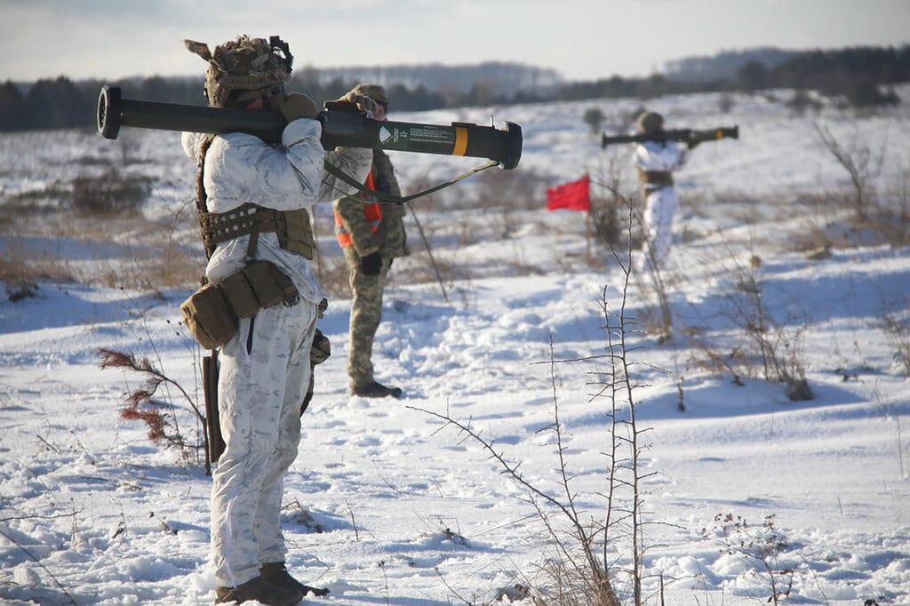 In this photo provided by the Ukrainian Defense Press Service and taken on Jan. 30, 2022, a Ukrainian soldier trains using the US M141 Bunker Defeat Munition (SMAW-D) missiles at the Yavoriv military training ground, close to Lviv, western Ukraine. (Ukrainian Defense Ministry Press Service via AP)