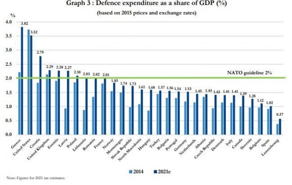 Προσώρας πάντως, βάσει των στοιχείων του ΝΑΤΟ για το 2021, μόνο δέκα από τις 30 χώρες μέλη-μέλη της Συμμαχίας έχουν πετύχει ή ξεπεράσει αυτό το όριο, με την Ελλάδα μάλιστα να κατέχει πλέον την πρώτη θέση, με 3,82% του ΑΕΠ -σχεδόν διπλάσιο από το στόχο, δηλαδή- ξεπερνώντας ακόμη και τις ΗΠΑ…
