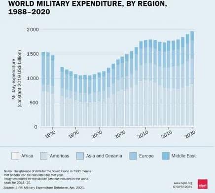 Πρακτικά, όλοι αυτοί οι πακτωλοί χρημάτων για εξοπλιστικά προγράμματα και τη συντήρηση στρατών το 2020 ξεπέρασαν ακόμη και τις δαπάνες που γίνονταν στο τέλος του Ψυχρού Πολέμου.