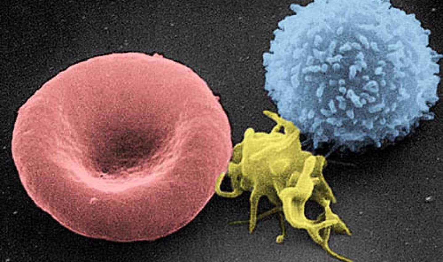 Από αριστερά, ανθρώπινο ερυθρό αιμοσφαίριο, θεομβοκύτταρο και Τ λεμφοκύτταρο (NCI-Frederick)