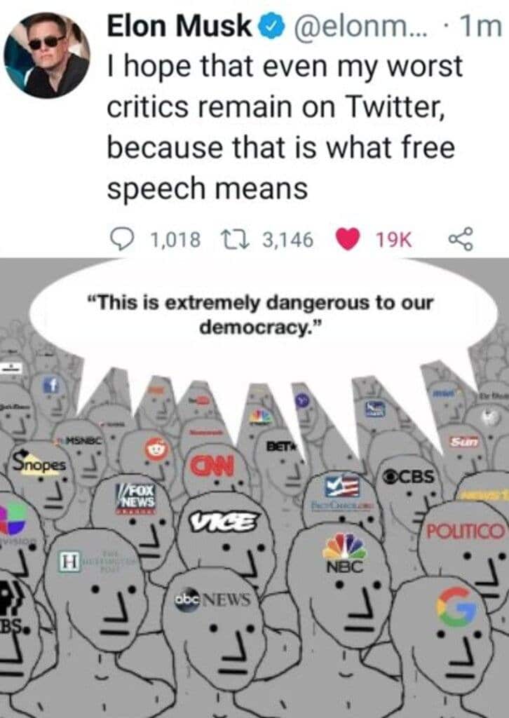 O Μασκ συνέχισε να twittάρει λέγοντας : «Για να αξίζει το Twitter την εμπιστοσύνη του κοινού, πρέπει να είναι πολιτικά ουδέτερο, πράγμα που πρακτικά σημαίνει ότι πρέπει να ενοχλεί εξίσου την ακροδεξιά και την ακροαριστερά».