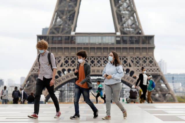People, wearing protective masks, walk near the Eiffel Tower as the French tourism landmark reopened to visitors after being evacuated in Paris, France, September 23, 2020. REUTERS/Charles Platiau
