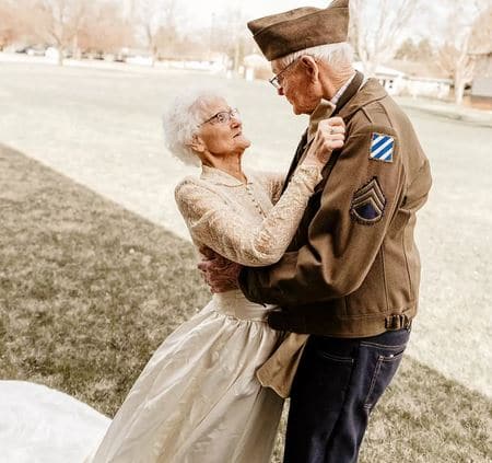 Όπως έγραψε η Anna, οι παππούδες της γνωρίστηκαν ενώ έκαναν πατινάζ και παντρεύτηκαν στις 6 Ιανουαρίου του 1952. Η γιαγιά της φόρεσε ένα φόρεμα των 35 δολαρίων και ένα βέλο των 15 δολαρίων. Το νυφικό της το κράτησε μέχρι σήμερα και το ξαναφόρεσε για την 70η επέτειό της. Είναι εντυπωσιακό το πόσο καλά έχει διατηρηθεί αυτό το κομμάτι στο πέρασμα των δεκαετιών, αλλά και το γεγονός ότι παραμένει στο μέγεθός της. Ο σύζυγός της, από την άλλη, για τις ανάγκες της επετειακής φωτογράφισης φόρεσε τη στρατιωτική στολή του, καθώς λίγο μετά το γάμο τους πήγε για εκπαίδευση στο στρατό και, αργότερα, πολέμησε στην Κορέα.