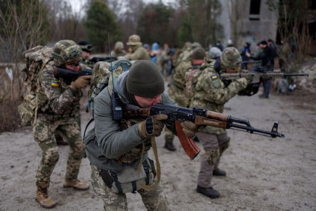 Reservists take part in a tactical training and individual combat skills conducted by the Territorial Defense of the Capital in Kyiv, Ukraine, February 19, 2022. REUTERS/Antonio Bronic