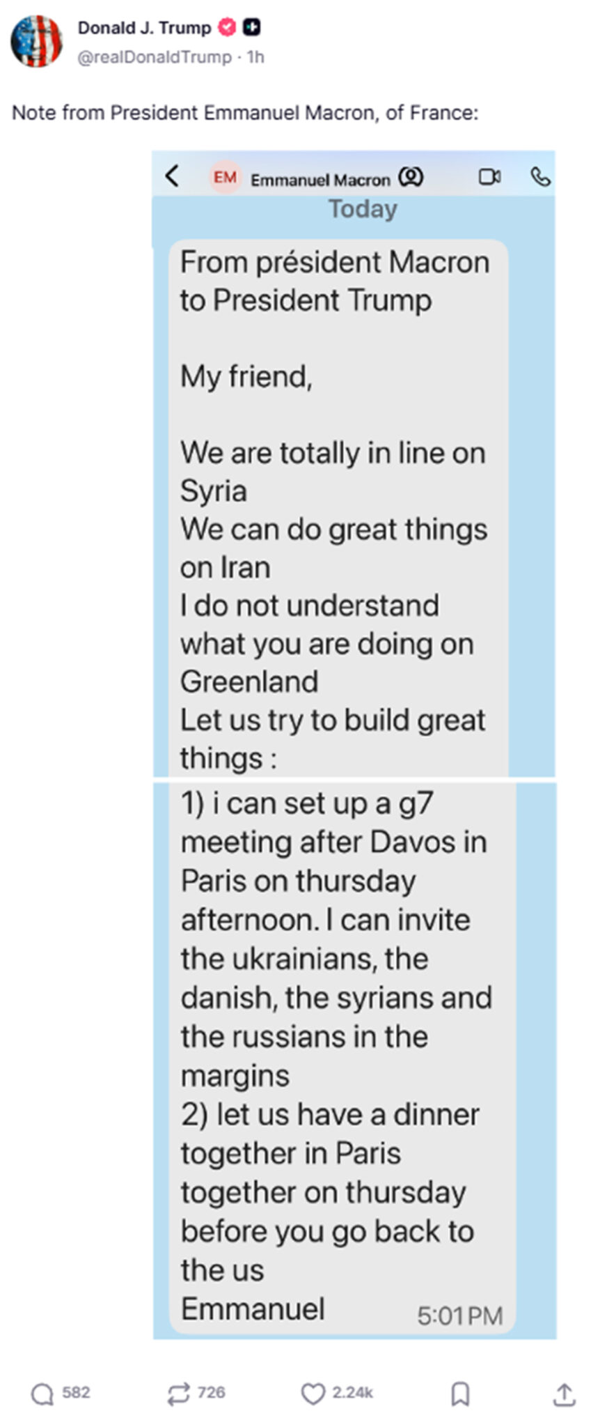 Ο Τραμπ δημοσίευσε ιδιωτικό μήνυμα του Μακρόν που του έγραφε «Δεν καταλαβαίνω τι κάνεις με τη Γροιλανδία» και απειλεί τη Γαλλία με δασμούς 200%