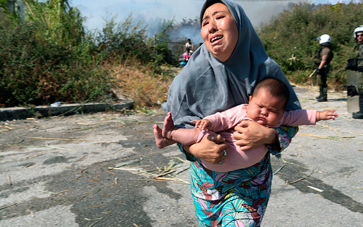 Κάποιες φωτιές στη Μόρια, οι οποίες αποδόθηκαν σε εμπρησμούς, συνέχισαν να καίνε και μέχρι τις αρχές της εβδομάδας, δημιουργώντας τρόμο στους διαμένοντες -ιδίως σε όσους καλούνται να προσέχουν όχι μόνο τους εαυτούς τους, αλλά και κάποιες ευάλωτες ομάδες ατόμων, όπως τα παιδιά. Η εικόνα αυτής της γυναίκας με το μωρό στην αγκαλιά της είναι χαρακτηριστική.