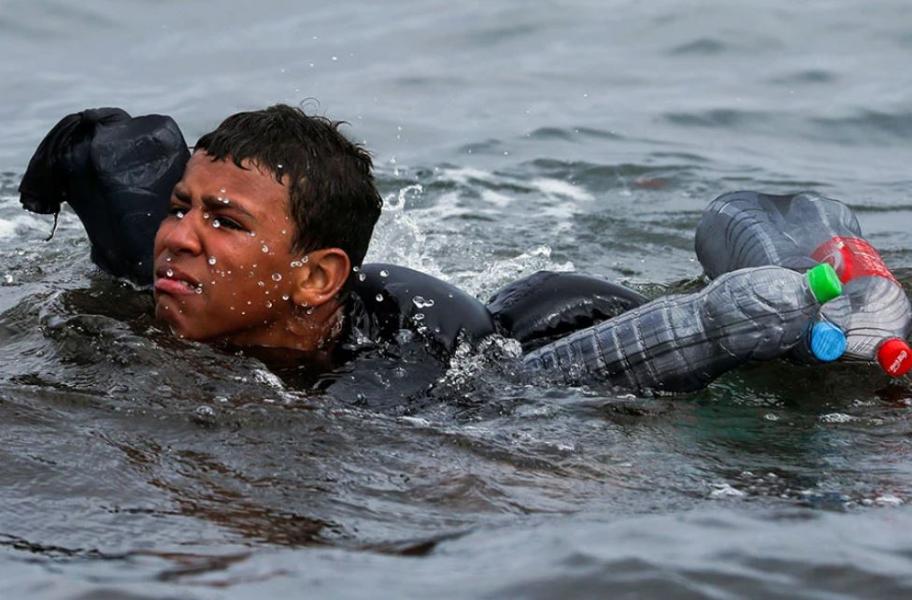 Μία από τις πιο συγκλονιστικές εικόνες που μεταδίδουν τα τηλεοπτικά δίκτυα τις τελευταίες ώρες είναι ενός αγοριού ηλικίας 13 έως 14 ετών να κολυμπάει στην παραλία της Θέουτα με δεκάδες άδεια πλαστικά μπουκάλια δεμένα στο σώμα του σαν σωσίβιο για να μπορέσει να επιπλεύσει.
