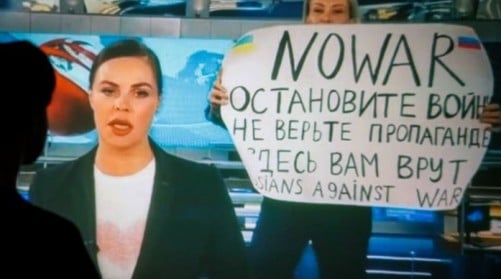 «Σταματήστε τον πόλεμο. Μην πιστεύετε την προπαγάνδα. Σας λένε ψέματα», έγραφε το πανό της Μαρίνα, σύμφωνα με άρθρο του περιοδικού Politico. Για λίγα δευτερόλεπτα η διαμαρτυρία της δημοσιογράφου προκάλεσε την έκπληξη των τηλεθεατών, προτού η μετάδοση διακοπεί. Η Μαρίνα συνελήφθη και προσήχθη σε αστυνομικό τμήμα της ρωσικής πρωτεύουσας. Από εκεί μεταφέρθηκε σε μυστικό χώρο κράτησης της κρατικής ασφάλειας, όπου παρέμεινε ανακρινόμενη για 14 ώρες.