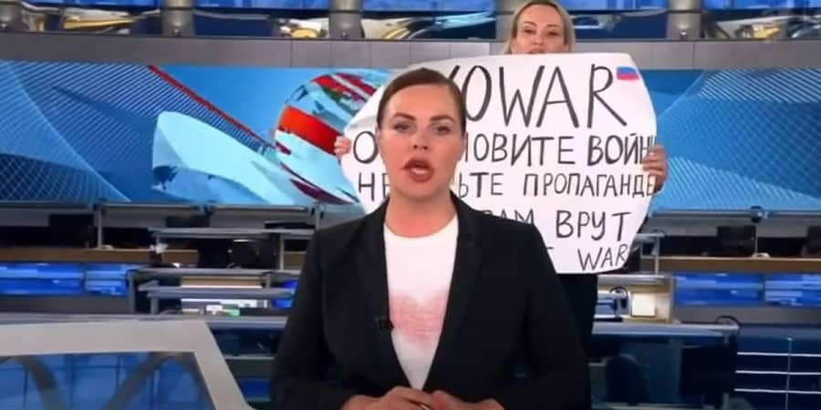 Η γυναίκα που εμφανίσθηκε κατά την διάρκεια του τηλεοπτικού δελτίου του προσκείμενου στο Κρεμλίνο Pervy Kanal (1ο Κανάλι) πίσω από την τηλεπαρουσιάστρια, κρατώντας ένα πλακάτ που έγραφε «Όχι στον Πόλεμο. Μην πιστεύετε την προπαγάνδα. Εδώ, σας λένε ψέματα», κινδυνεύει με ποινή κάθειρξης έως και 15 ετών.
