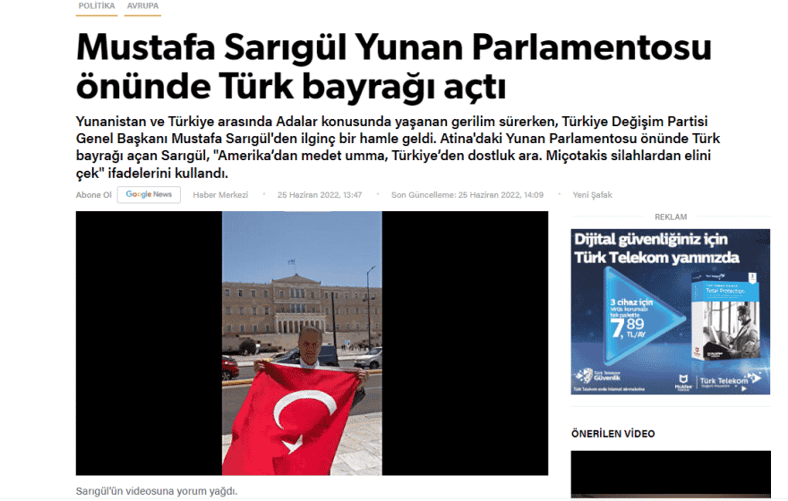 Σχετικό δημοσίευμα της  Yeni Safak, σχολιάζοντας την ένταση που επικρατεί μεταξύ Ελλάδας και Τουρκίας  χαρακτηρίζει «ενδιαφέρουσα» την κίνηση του προέδρου του TDP να ανοίξει την τουρκική σημαία μπροστά από την Βουλή των Ελλήνων.