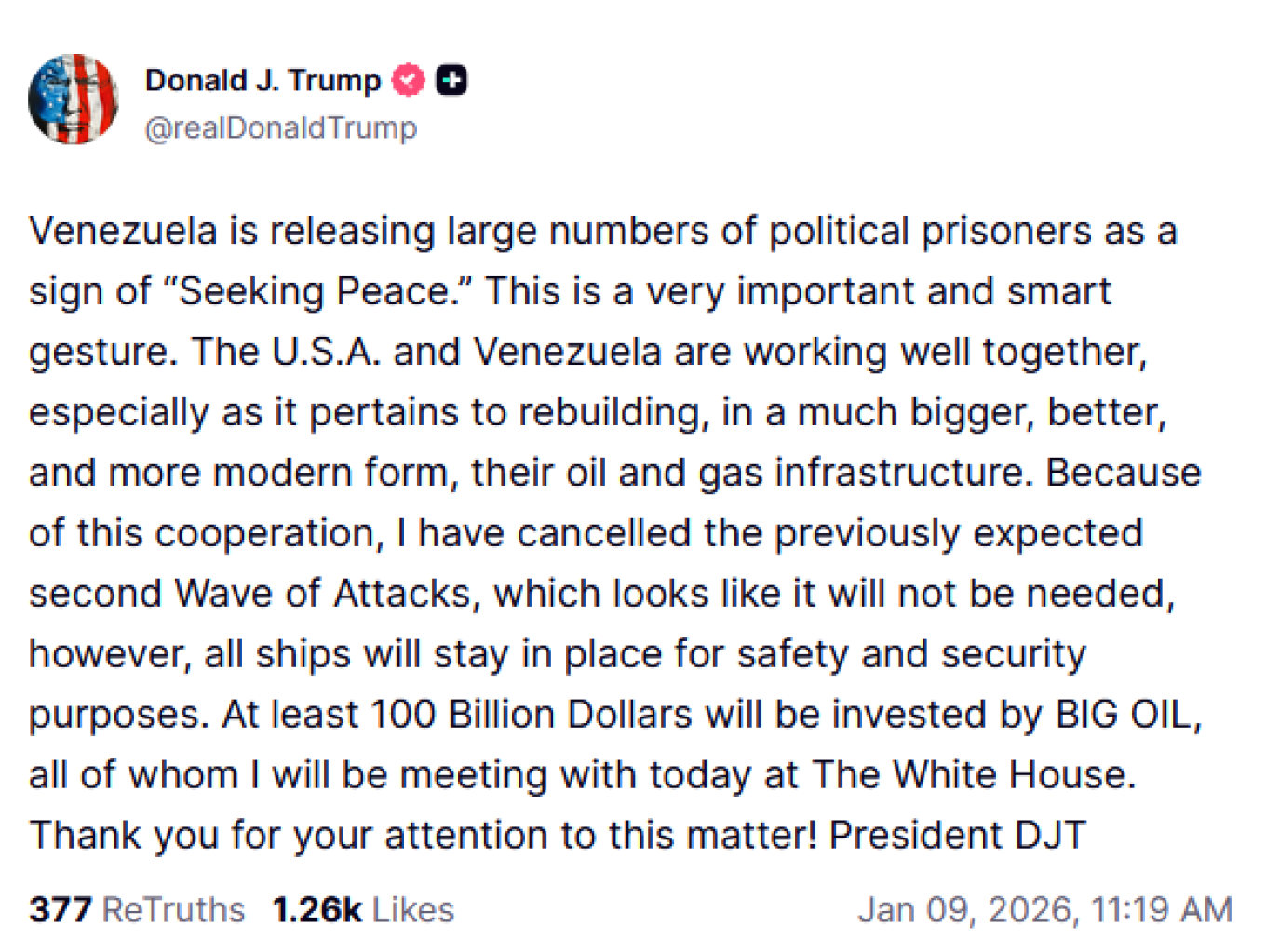 Εξηγώντας το σκεπτικό του, ο πρόεδρος των ΗΠΑ έγραψε στην ανάρτησή του ότι «η Βενεζουέλα απελευθερώνει μεγάλο αριθμό πολιτικών κρατουμένων ως ένδειξη “αναζήτησης ειρήνης”».