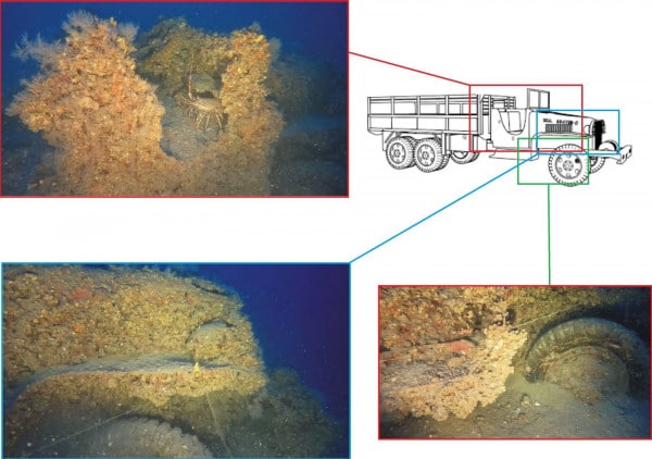 Φωτογραφική αποτύπωση και σχέδιο σε ένα από τα στρατιωτικά φορτηγά που βρέθηκαν πλησίον του ναυαγίου ΤΡΕΙΣ ΙΕΡΑΧΕΣ