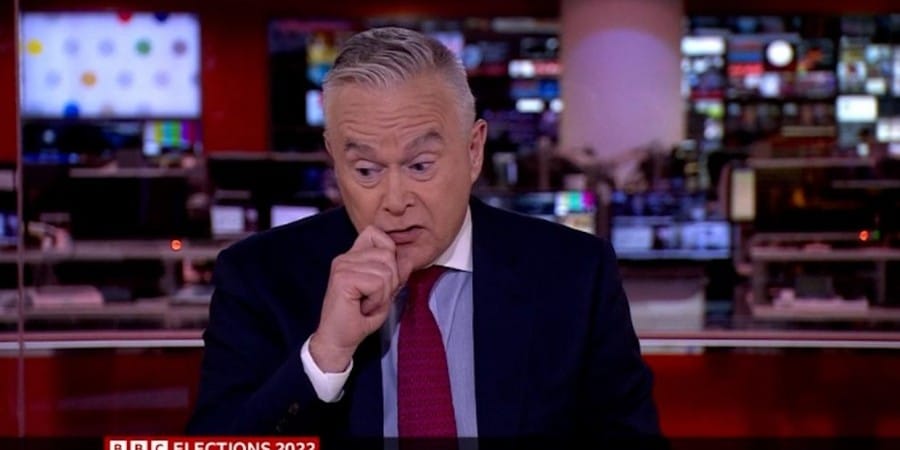 Η κάμερα επέστρεψε νωρίτερα από το αναμενόμενο με τον Huw Edwards να μην έχει προλάβει να φάει το σνακ του.