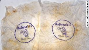 Στη συνέχεια πήραν την τσάντα στην κουζίνα τους για να την ανοίξουν προσεκτικά. Μέσα βρήκαν δύο περιτυλίγματα χάμπουργκερ και μερικές μισοφαγωμένες τηγανητές πατάτες δεκαετιών — που ήταν τραγανές και καφέ.