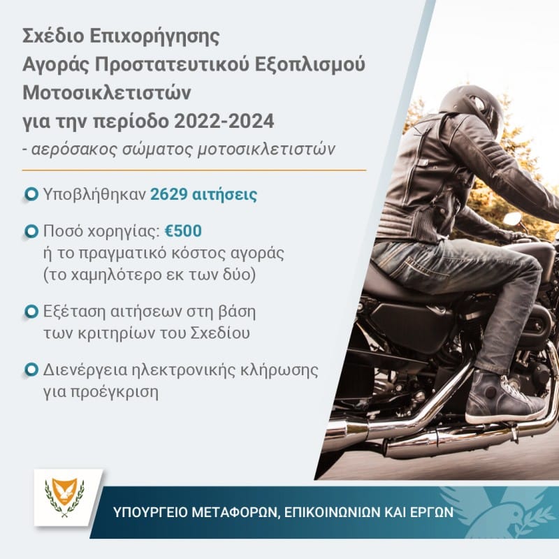 Το Υπουργείο Μεταφορών ανακοινώνει την ολοκλήρωση της διαδικασίας υποβολής αιτήσεων για το Σχέδιο Επιχορήγησης για Αγορά Προστατευτικού Εξοπλισμού για Μοτοσικλετιστές. Έχουν υποβληθεί 2.629 αιτήσεις για επιχορήγηση αγοράς αερόσακου σώματος μοτοσικλετιστή, εκ των οποίων οι 153 αφορούν την κατηγορία χαμηλής ισχύος. Ο αριθμός των αιτήσεων θεωρείται ιδιαίτερα ενθαρρυντικός, και αποδεικνύει ότι οι μοτοσικλετιστές αντιλαμβάνονται την αναγκαιότητα χρήσης επιπρόσθετου εξοπλισμού για την ασφάλειά τους στο οδικό δίκτυο.