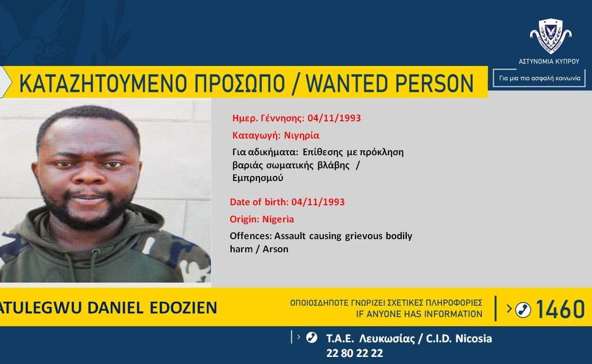 Η Αστυνομία καταζητεί τον ATULEGWU DANIEL EDOZIEN, 29 ετών από τη Νιγηρία, για διευκόλυνση των ανακρίσεων, σχετικά με διερευνώμενη υπόθεση επίθεσης και πρόκλησης βαριάς σωματικής βλάβης και εμπρησμού, αδικήματα τα οποία διαπράχθηκαν μεταξύ των ημερομηνιών 9-14/11/2022 στην επαρχία Λευκωσίας.