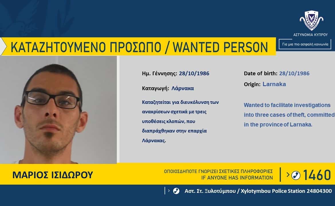Η Αστυνομία καταζητεί τον Μάριο Ισιδώρου, 36 ετών, από τη Λάρνακα, σε σχέση με τρεις διερευνώμενες υποθέσεις κλοπών, που διαπράχθηκαν στην επαρχία Λάρνακας, μεταξύ των ημερομηνιών 05/02/2022- 29/07/2022.
