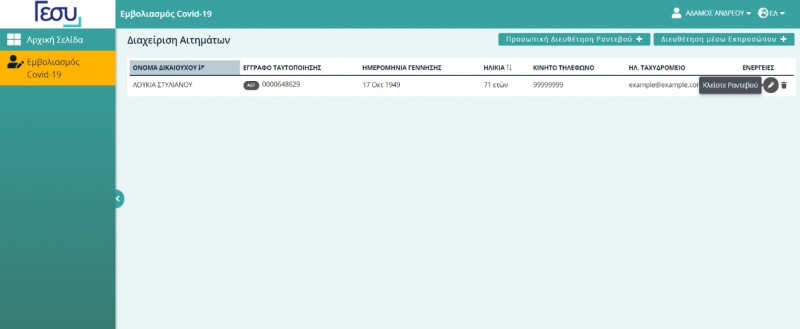Στην Πύλη Εμβολιασμού εμφανίζονται ως ακολούθως τα αιτήματα που έχουν καταχωρηθεί για ένα ή περισσότερους δικαιούχους από τον εκπρόσωπο. Για διευθέτηση ραντεβού, ο εκπρόσωπος επιλέγει για τον εκάστοτε δικαιούχο από τη στήλη «Ενέργειες», την επιλογή «Κλείστε Ραντεβού» », όταν η Πύλη Εμβολιασμού είναι διαθέσιμη για την ηλικιακή ομάδα του δικαιούχου.