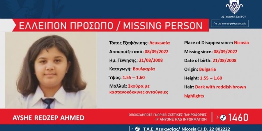 Η Αστυνομία ζητά πληροφορίες που μπορούν να βοηθήσουν στον εντοπισμό της AYSHE REDZEP AHMED, 14 ετών, από τη Βουλγαρία, η οποία απουσιάζει από το χώρο διαμονής της, στη Λευκωσία, από τις 8 Σεπτεμβρίου 2022.