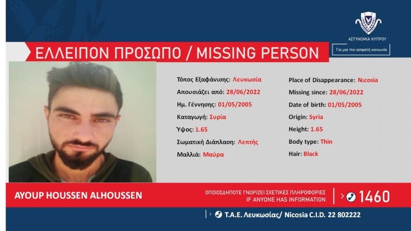 Η Αστυνομία ζητά πληροφορίες που μπορούν να βοηθήσουν στον εντοπισμό του AYOUP HOUSEEN ALHOUSSEN, 17 ετών από τη Συρία, ο οποίος απουσιάζει από τις 28/06/2022, από τον χώρο διαμονής του στη Λευκωσία.