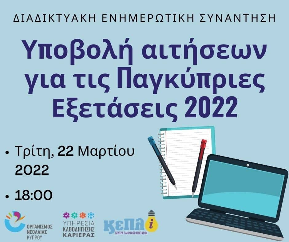 Διαδικτυακή ενημερωτική συνάντηση από την Υπηρεσία Καθοδήγησης Καριέρας του Οργανισμός Νεολαίας Κύπρου / Youth Board of Cyprus με σκοπό την ενημέρωση για τον τρόπο συμπλήρωσης της αίτησης για τις Παγκύπριες εξετάσεις, τη διαδικασία υποβολής της αλλά και για να απαντήσει σε απορίες μαθητών και γονέων.