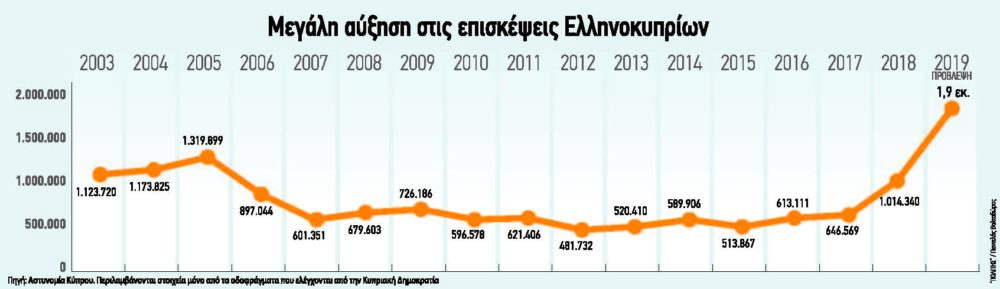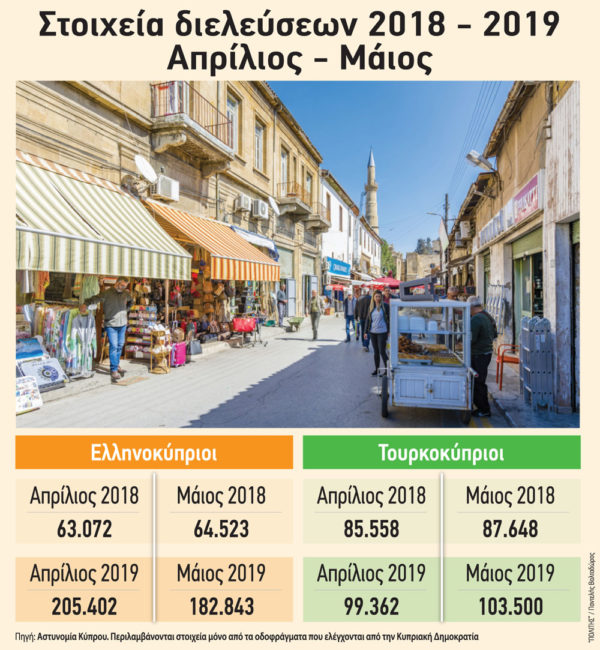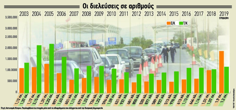 Μέχρι τα τέλη Μαΐου από όλα τα οδοφράγματα (εκτός Περγάμους και Στροβιλιών) πέρασαν συνολικά 800.608 Ε/Κ έναντι 514.654 Τ/Κ. Εάν συνεχιστούν οι ίδιες τάσεις κατά τις οποίες τους μήνες Απρίλιο και Μάιο υπήρξε τριπλασιασμός των διελεύσεων Ε/Κ όπως φαίνεται και στο πρωτοσέλιδο γράφημα του «Π», τον Ιούνιο θα ισοφαρίσει σχεδόν ο αριθμός των Ε/Κ που πέρασαν τα οδοφράγματα για ολόκληρο τον χρόνο πέρσι, που άγγιξε το 1,01 εκατ. διελεύσεις. Προβλέπεται επίσης ότι μέχρι τα τέλη του 2019 θα διπλασιαστούν (σχεδόν) οι διελεύσεις των Ε/Κ έναντι του 2018 και θα τριπλασιαστούν σε σχέση με το 2017 και το 2016. Η αύξηση στις διακινήσεις Ε/Κ στην άλλη πλευρά που καταγράφηκε κατά το 2018 έναντι του 2017 ήταν 52%. Σύμφωνα λοιπόν με τις προβλέψεις ενδέχεται ο αριθμός των Ε/Κ που θα περάσει στα κατεχόμενα να φτάσει το 1,9 εκατ. άτομα.