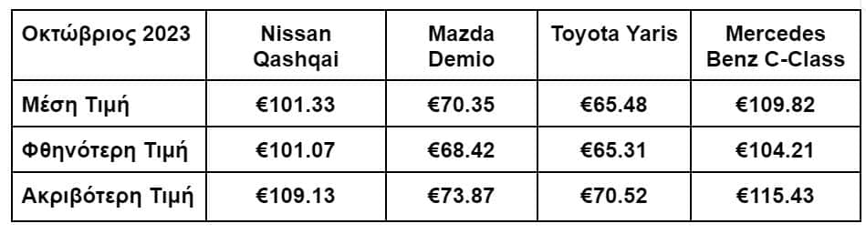 Την ίδια ώρα, εάν ένας κάτοχος Mazda Demio του 2014, με χωρητικότητα καυσίμων τα 44 λίτρα, επιλέξει να γεμίσει το ντεπόζιτό του, ο λογαριασμός του θα κυμανθεί από 68 – 74 ευρώ. Παράλληλα, για ένα Toyota Yaris ZR, χωρητικότητας 42 λίτρων, χρειάζονται 65 – 70 ευρώ.