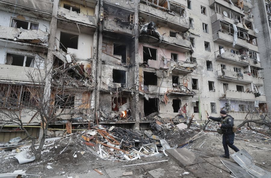 epa09783574 Aftermath of an overnight shelling at a residential area in Kiev, Ukraine, 25 February 2022. Russian troops entered Ukraine on 24 February prompting the country's president to declare martial law. EPA/SERGEY DOLZHENKO