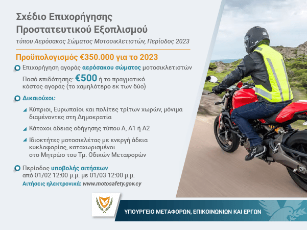 Αιτήσεις θα γίνονται δεκτές μέχρι την 01/03/2023 στις 12μ. ηλεκτρονικά στην ιστοσελίδα www.motosafety.gov.cy (link is external)και αφορούν στην επιχορήγηση Γιλέκου Σώματος Μοτοσικλετιστή με ύψος επιχορήγησης μέχρι τα €500 συμπεριλαμβανομένου Φ.Π.Α.