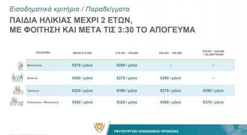 • Οικογένειες που έχουν εγκριθεί για Επίδομα Τέκνου για το έτος εντός του οποίου αρχίζει το Σχολικό Έτος, με ετήσιο οικογενειακό εισόδημα για το προηγούμενο ημερολογιακό έτος που να μην υπερβαίνει τα καθορισμένα όρια