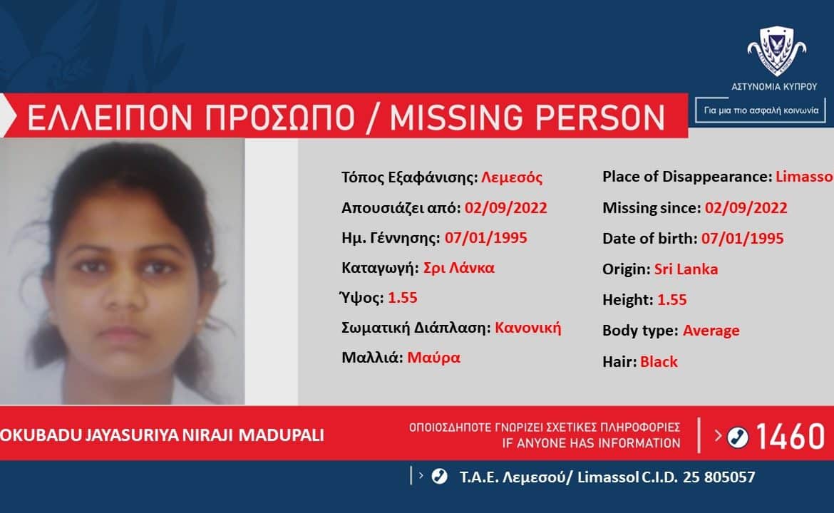 Η Αστυνομία ζητά πληροφορίες που μπορούν να βοηθήσουν στον εντοπισμό της LOKUBADU JAYASURIYA NIRAJI MADUPALU, 27 ετών, από τη Σρι Λάνκα, η οποία ελλείπει από την οικία της, στη Λεμεσό, από τις 2 Σεπτεμβρίου 2022.