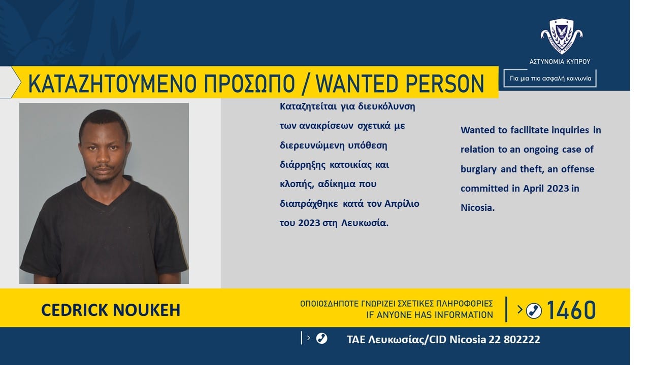 Η Αστυνομία ζητεί πληροφορίες για εντοπισμό του CEDRICK NOUKEH, 24 ετών από το Καμερούν, η φωτογραφία του οποίου δημοσιεύεται, σχετικά με διερευνώμενη υπόθεση διάρρηξης κατοικίας και κλοπής, αδίκημα που διαπράχθηκε κατά τον Απρίλιο του 2023 στη Λευκωσία.