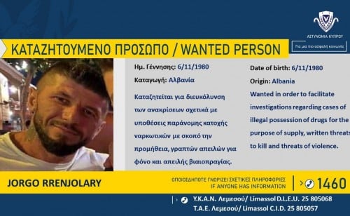 Η Αστυνομία ζητά πληροφορίες που μπορούν να βοηθήσουν στον εντοπισμό του Jorgo Rrenjolari, από την Αλβανία, 41 ετών, εναντίον του οποίου εκκρεμούν δικαστικά εντάλματα σύλληψης για διευκόλυνση των ανακρίσεων σχετικά με δύο υποθέσεις που διερευνώνται από την ΥΚΑΝ (Επαρχιακό Κλιμάκιο Λεμεσού) και το ΤΑΕ Λεμεσού.