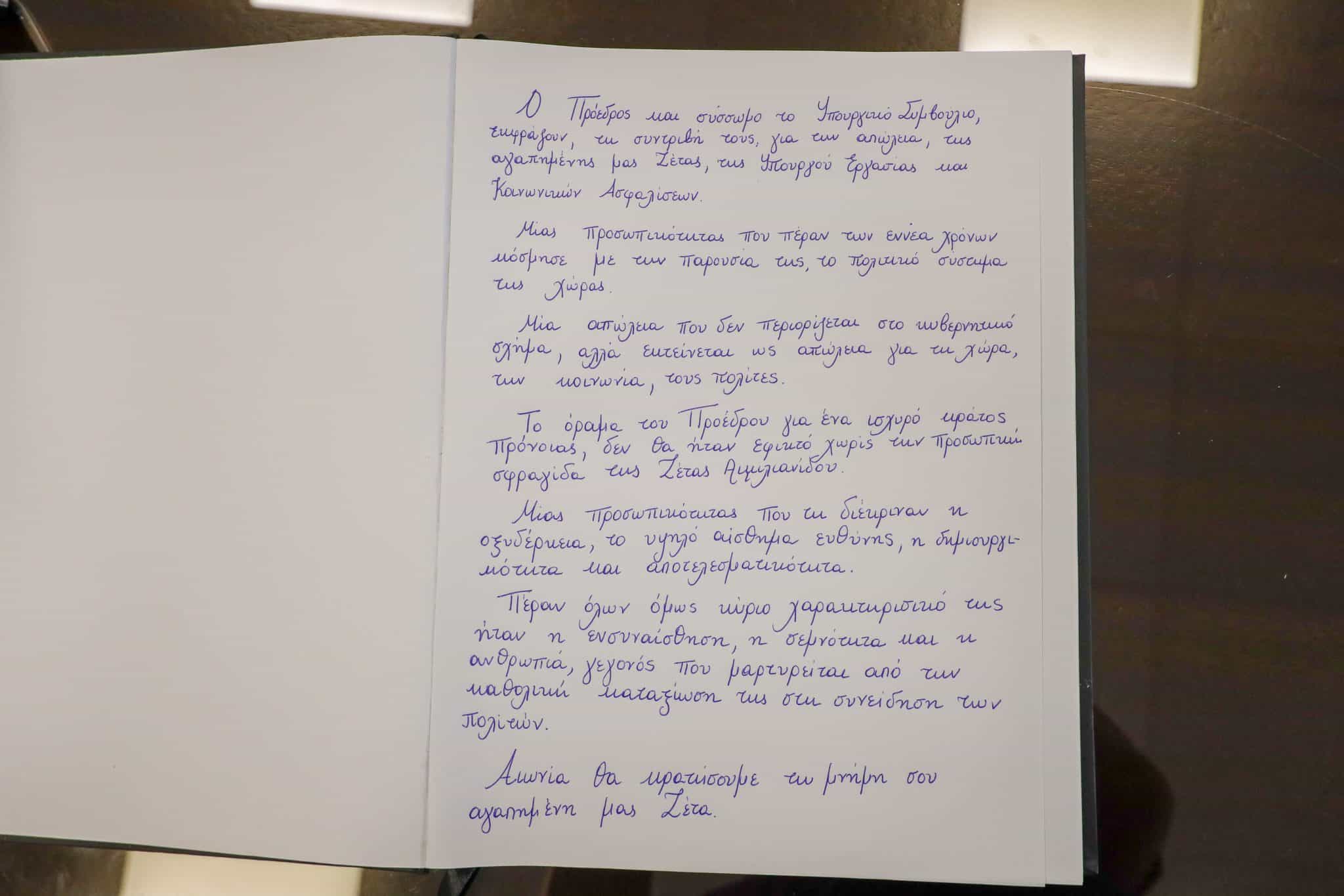 «Ο Πρόεδρος και σύσσωμο το Υπουργικό Συμβούλιο εκφράζουν τη συντριβή τους, για την απώλεια της αγαπημένης μας Ζέτας, της Υπουργού Εργασίας και Κοινωνικών ασφαλίσεων.