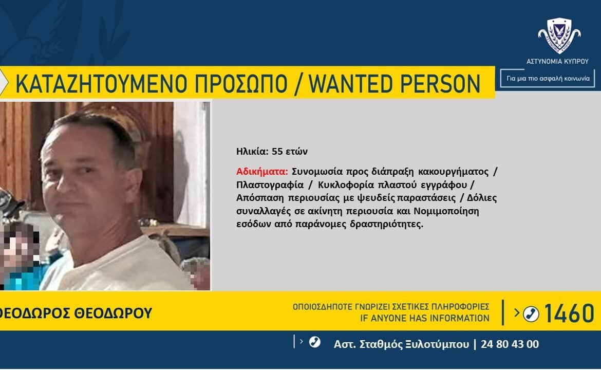 Η Αστυνομία ζητά πληροφορίες, που μπορούν να βοηθήσουν στον εντοπισμό του Θεόδωρου Θεοδώρου, 55 ετών από τη Ξυλοτύμπου, εναντίον του οποίου εκκρεμεί ένταλμα σύλληψης από το Κακουργιοδίκειο Λάρνακας, για παράλειψη εμφάνισης του στο Δικαστήριο, για τα αδικήματα της συνομωσίας προς διάπραξη κακουργήματος, πλαστογραφίας, κυκλοφορίας πλαστού εγγράφου, απόσπασης περιουσίας με ψευδείς παραστάσεις, δόλιες συναλλαγές σε ακίνητη περιουσία και νομιμοποίησης εσόδων από παράνομες δραστηριότητες.