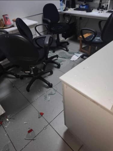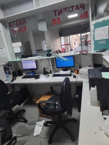 Εικόνες από το νοσοκομείο που δημοσιεύτηκαν στο Facebook έδειχναν θρυμματισμένα γυαλιά στο πάτωμα, τις καρέκλες και τα γραφεία μιας αίθουσας υποδοχής.