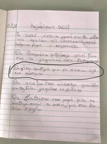 Ένα 7χρονο αγόρι λοιπόν συγκινεί γράφοντας τους στόχους και τις σκέψεις για το νέο έτος. Το χειρόγραφο του παιδιού δημοσιεύθηκε δημόσια σε σελίδα εκπαιδευτικών (μετά από συγκατάθεση των γονιών του). μεταξύ άλλων στόχων το παιδί εκφράζει τη σκέψη να.. γίνει εμβόλιο «για να σώσει όλο τον κόσμο»!